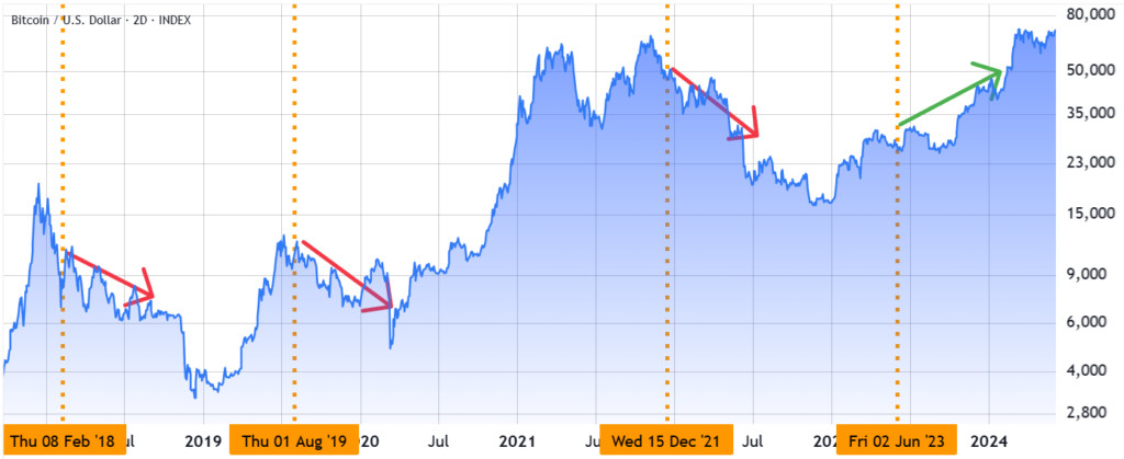 گرچه چند تحلیل معتبر چشماندازی صعودی برای بیت کوین ارائه دادهاند، اما تجربه افزایش یا تعلیقهای قبلی سقف بدهی آمریکا، معمولاً شش ماه پس از آن نتایجی نزولی برای قیمت بیت کوین داشته است. در واقع، تنها موردی که بیت کوین بعد از چنین رویدادی رشد کرد، به ژوئن ۲۰۲۳ برمیگردد.