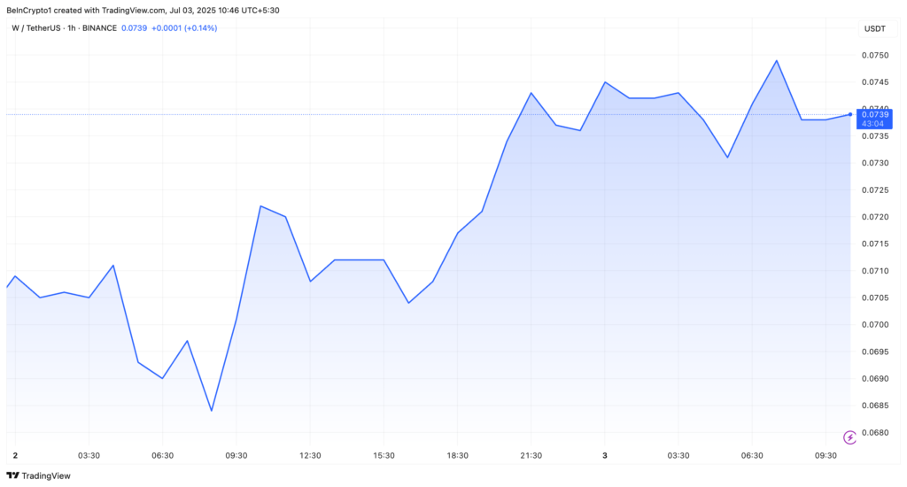 بر اساس دادههای بازار، قیمت توکن W طی ۲۴ ساعت گذشته ۳.۵٪ افزایش قیمت یافته و اکنون با قیمت ۰.۰۷۳ دلار معامله میشود. همچنین، حجم معاملات آن به بیش از ۸۱ میلیون دلار رسیده که ۴.۶۸٪ بیشتر از روز قبل است.