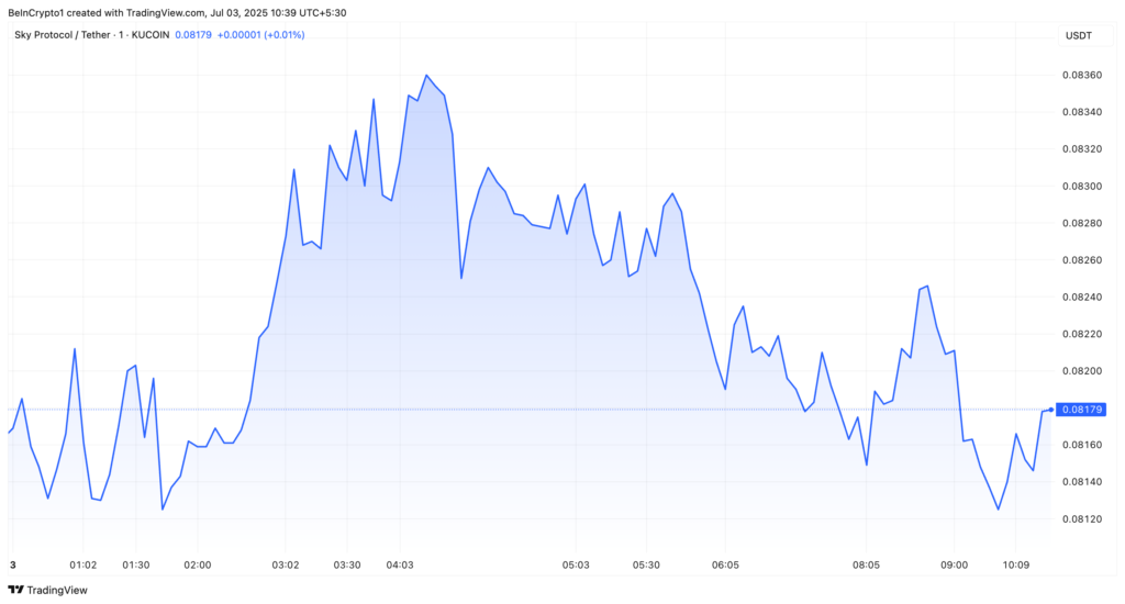 افزوده شدن این دو توکن به نقشه راه کوین بیس واکنش بازار را برانگیخت. پس از اعلام این خبر، قیمت توکن SKY به ۰,۰۹۱ دلار رسید. این یعنی رشد ۱۱٪ قیمت و بازتاب خوشبینی سرمایهگذاران نسبت به لیست شدن آن.
