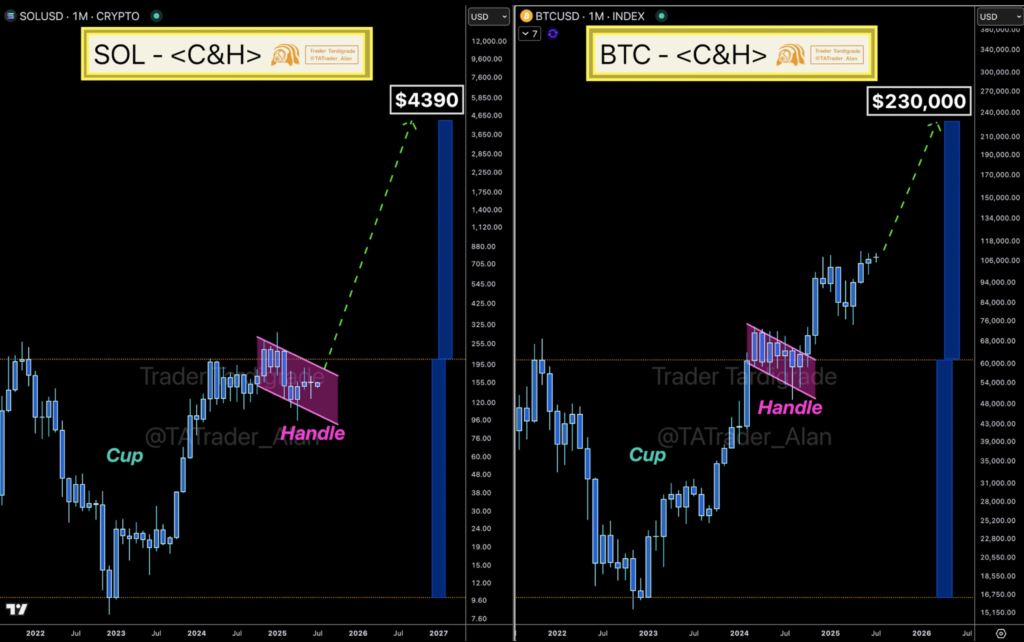 این الگو اهداف ۲۳۰,۰۰۰ دلاری برای BTC و ۴,۳۹۰ دلاری برای SOL تعیین میکند.