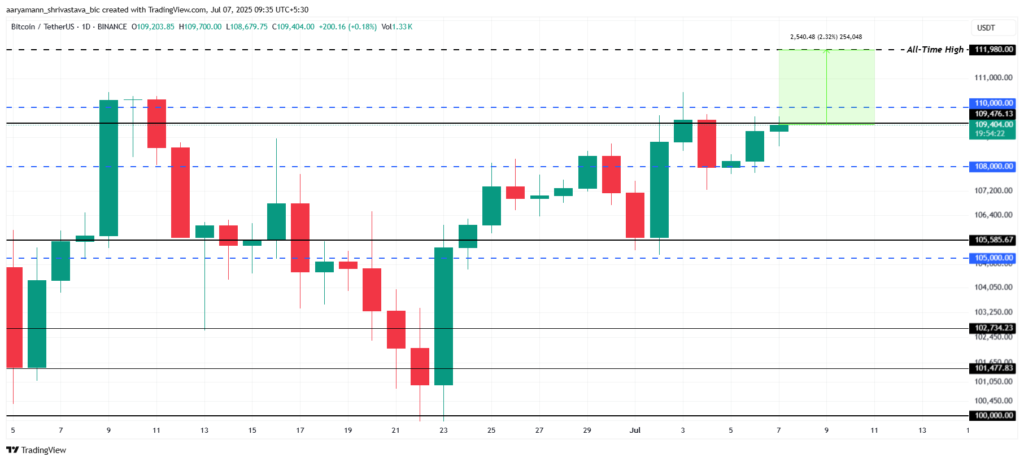 بیت کوین هماکنون در زمان نگارش مطلب با قیمت ۱۰۸٬۸۴۱ دلار معامله میشود؛ درست کمی پایینتر از مقاومت ۱۰۹٬۴۷۶ دلار. جهش از ۱۰۸٬۰۰۰ دلار موقعیتی قوی ایجاد کرده و تارگت بعدی سطح ۱۱۰٬۰۰۰ دلار است. در صورت عبور موفق، نگاهها به سقف تاریخی ۱۱۱٬۹۸۰ دلار دوخته میشود.