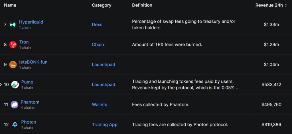 رتبهبندی پروتکلهای مختلف بر اساس درآمد آنها – منبع: DefiLlama