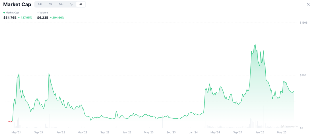 طبق دادههای سایت کوینمارکتکپ (CoinMarketCap)، ارزش بازار میم کوینها در ۲۴ ساعت گذشته ۲.۶٪ کاهش یافته و به ۵۴.۷ میلیارد دلار رسیده است.