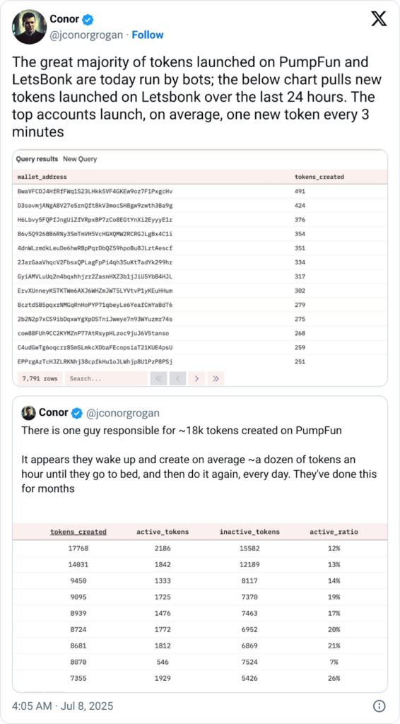کانر گروگان (Conor Grogan) – رئیس بخش محصول در صرافی کوین بیس (CoinBase) – گفت که به احتمال زیاد میم کوینهایی که در پلتفرمهای پامپ فان (Pump.fun) و لتس بونک (LetsBonk) راهاندازی میشوند، توسط رباتها ایجاد شدهاند.