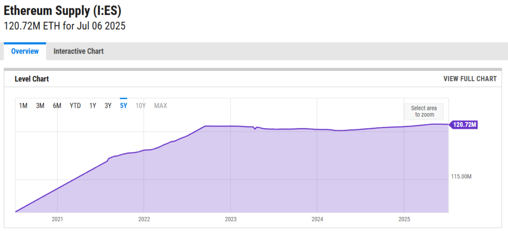 از زمان بروزرسانی مرج (Merge) در سپتامبر ۲۰۲۲، نرخ عرضه اتریوم به طور قابل توجهی کاهش یافته و طبق دادههای Ycharts، در این بازه تنها حدود ۳۰۰ هزار واحد توکن جدید به بازار عرضه شده است.