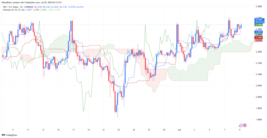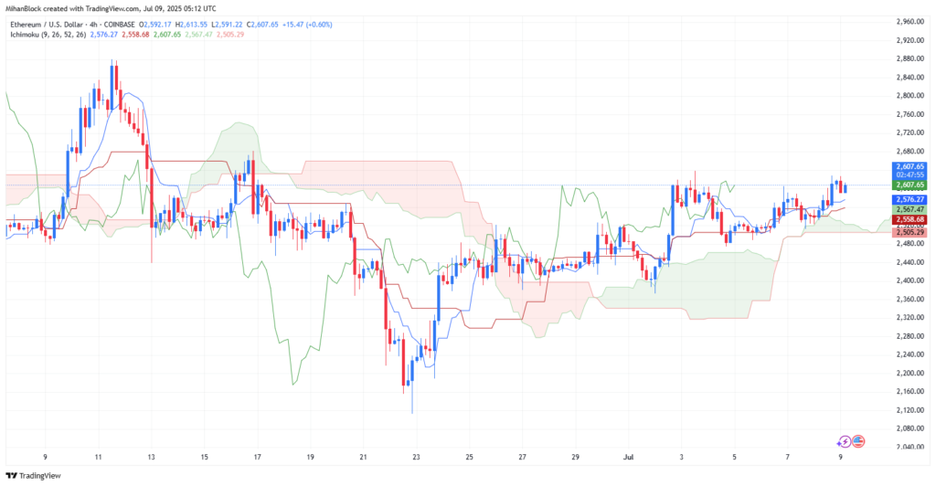 در نمودار چهارساعته، قیمت اتریوم در حال حاضر بالای ابر کومو قرار دارد که این یک سیگنال صعودی محسوب میشود.