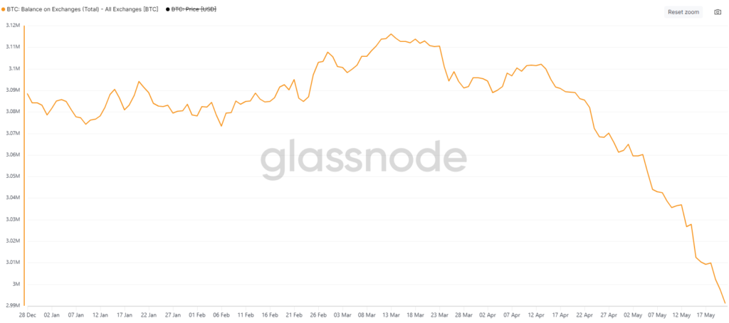 دادههای گلسنود نشان میدهد ذخایر بیت کوین در تمامی صرافیها در تاریخ ۲۱ می (۳۱ اردیبهشت) به ۲.۹۹ میلیون بیت کوین کاهش یافته که کمتر از ۳.۱۱ میلیون بیت کوین ثبتشده در ۱۳ مارس (۲۳ اسفند) است.