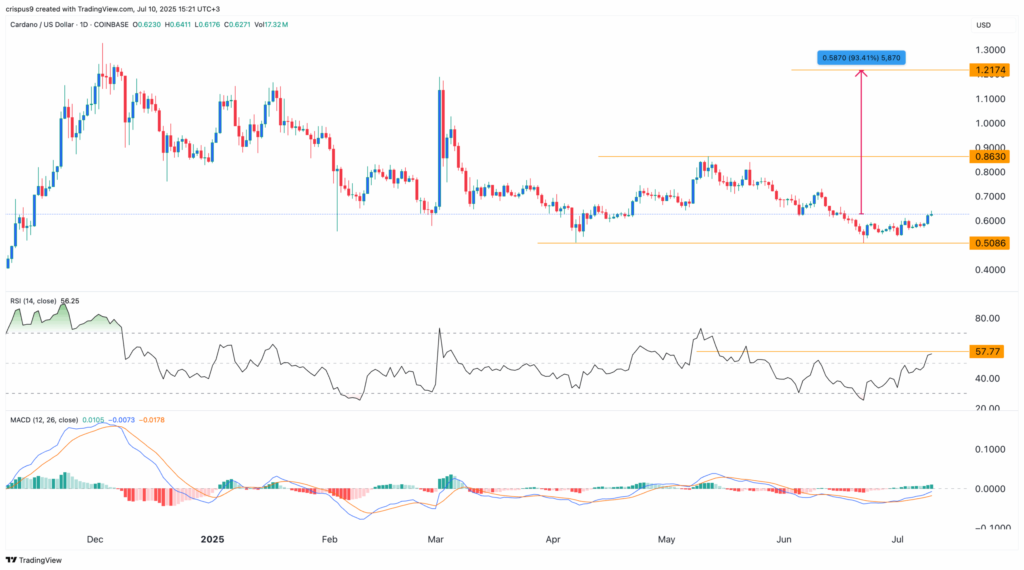 قیمت ADA در روزهای اخیر بهطور ملایم بهبود یافته و شاخصهای تکنیکال آن همچنان به روند صعودی اشاره دارند. هدف اولیه، رسیدن به سطح ۰.۸۶۳۰ دلار است که همان خط گردن الگوی کف دوقلو بهشمار میرود. اگر این سطح شکسته شود، میتوان انتظار رشد بیشتر تا هدف ۱.۲۱۵۳ دلار را داشت.