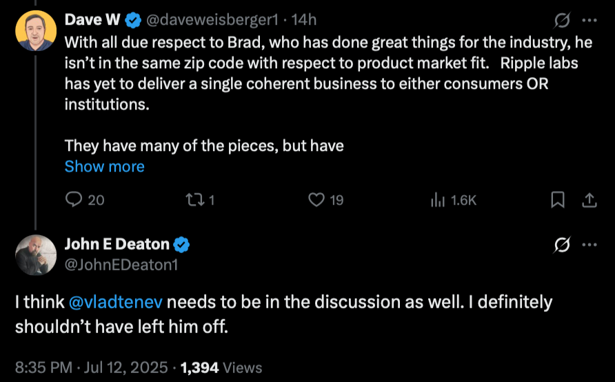 جان دیتن در پستی که در شبکه اجتماعی ایکس (X) منتشر کرد گفت که بهنظر او، لقب استیو جابز کریپتو باید به یکی از این دو نفر داده شود: یا برد گارلینگهاوس، مدیرعامل ریپل یا برایان آرمسترانگ (Brian Armstrong)، مدیرعامل کوینبیس (Coinbase). دیتن این جمله را در پاسخ به سوال یکی از کاربران نوشت که پرسیده بود چه کسی در صنعت کریپتو میتواند معادل استیو جابز باشد.