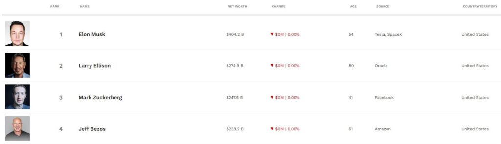 در حال حاضر، ایلان ماسک که مدیرعامل شرکتهای اسپیس اکس (SpaceX) و تسلا (Tesla) است، با بیش از ۴۰۴ میلیارد دلار دارایی، ثروتمندترین فرد جهان در فهرست فوربز است.