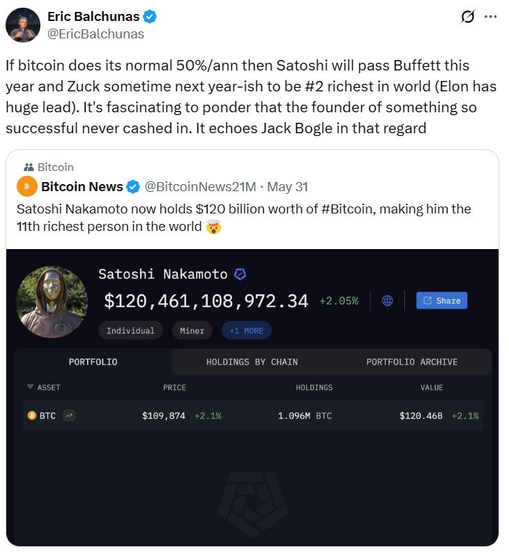 اریک بالکوناس (Eric Balchunas) – تحلیلگر شرکت بلومبرگ (Bloomberg) – در تاریخ ۲ ژوئن پستی در شبکه X منتشر و پیشبینی کرد که ساتوشی ناکاموتو تا پایان سال ۲۰۲۶ میتواند دستکم دومین میلیاردر ثروتمند جهان شود. او گفت که اگر بیت کوین طبق روند معمول خود سالانه ۵۰٪ رشد کند، احتمالاً ناکاموتو در حدود سال آینده به رتبه دوم میرسد. او افزود: