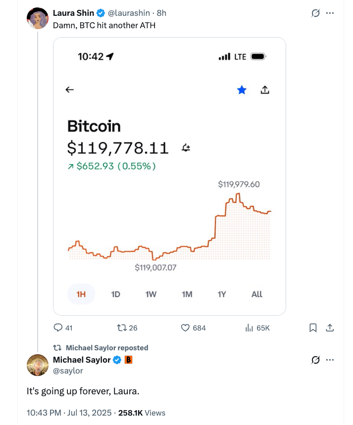 مایکل سیلر که از حامیان سرسخت بیت کوین است در شبکههای اجتماعی همچنان دیدگاه صعودی خودش را با شور و اشتیاق بیان میکند. او در واکنش به لورا شین (Laura Shin)، بنیانگذار پادکست Unchained، که درباره عبور قیمت بیت کوین از ۱۱۹ هزار دلار در شبکه اجتماعی ایکس نوشت: