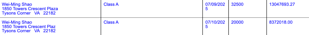 طبق این اسناد، وی مین شائو (Wei-Ming Shao)، معاون ارشد اجرایی استراتژی، در مجموع ۶۲٬۵۰۰ سهم از سهام عادی شرکت استراتژی (MSTR) به ارزش تقریبی ۲۵.۷ میلیون دلار فروخته است.
