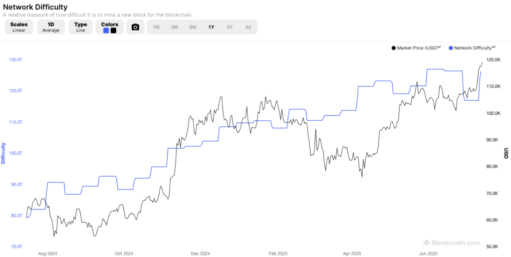 بر اساس دادههای بلاکچین دات کام (Blockchain.com)، سختی استخراج بیت کوین با ۷.۹۶٪ افزایش به ۱۲۶.۲۷ تریلیون رسیده است و میانگین هشریت (Hashrate) شبکه در هفت روز گذشته ۹۰۸.۸۲ EH/s بوده است. این رقم نشاندهنده قدرت محاسباتی رو به رشد ماینرها است، بهویژه با توجه به اینکه قیمت بیت کوین اخیراً به ۱۲۲,۰۰۰ دلار رسیده است.