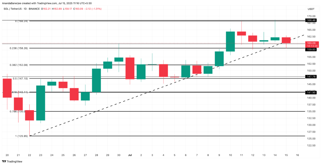 با وجود افت قیمت تا ۱۵۹.۷ دلار، سولانا هنوز بالای سطح حمایتی مهم ۱۵۸ دلار قرار دارد. این سطح با ابزار فیبوناچی مشخص شده و در تحلیل روندهای صعودی کاربرد دارد.