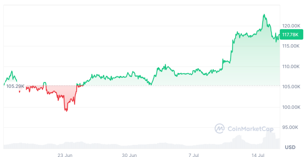 بیت کوین تنها چند روز پس از عبور از رکورد تاریخی ۱۱۱٬۹۷۰ دلاری در ۹ جولای (۱۸ تیر)، به سقف جدید ۱۲۲٬۸۸۴ دلاری رسید و سپس وارد روند صعودی شد که تا آخر هفته ادامه یافت.
