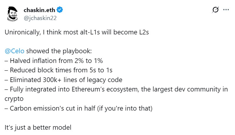 جیسون چسکین – مدیر ارتباط با اپلیکیشنها و تحقیقات در بنیاد اتریوم – در روز دوشنبه بحثی را مطرح کرد که طبق آن، بیشتر بلاکچینهای لایه اول در نهایت به لایه دومهای اتریوم تبدیل خواهند شد. او از مهاجرت اخیر بلاکچین سلو (Celo) بهعنوان یک الگو نام برد. او گفت که این انتقال به سلو کمک کرده تا نرخ تورم خود را کاهش دهد، کدهای خود را سادهتر کند، زمان ساخت بلاکها را سرعت ببخشد و با شبکه اتریوم که به گفته او «بزرگترین جامعه توسعهدهندگان دنیای کریپتو» را دارد، یکپارچه شود.