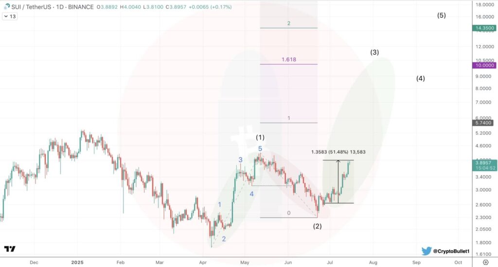 یکی دیگر از تحلیلگران با نام کریپتو بولت (Crypto Bullet)، معتقد است که SUI وارد موج سوم شده است. او انتظار دارد قیمت این آلت کوین به محدوده دو رقمی برسد. به گفته او، SUI از کف قیمتی آوریل (فروردین) حرکت صعودی کاملی از نوع ۱ تا ۵ داشته که موج (۱) در درجه بالاتر محسوب میشود؛ سپس در فاصله اواخر می (اردیبهشت) تا اوایل ژوئن (خرداد)، وارد موج اصلاحی دوم شد.