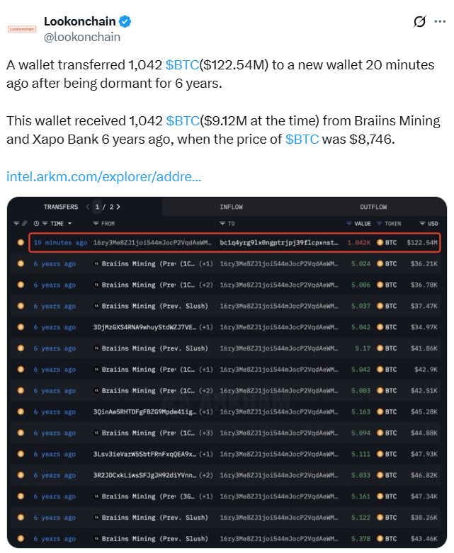 در کنار این نهنگ عظیم، یک نهنگ کوچکتر هم این هفته پس از ۶ سال بیتحرک ماندن، کیف پول خود را خالی کرده است. طبق گزارش لوکآنچین، این نهنگ حدود ۱,۰۴۲ بیت کوین به ارزش تقریبی ۱۲۳ میلیون دلار را به یک کیف پول جدید منتقل کرده؛ جایی که این دارایی همچنان نگهداری میشود.