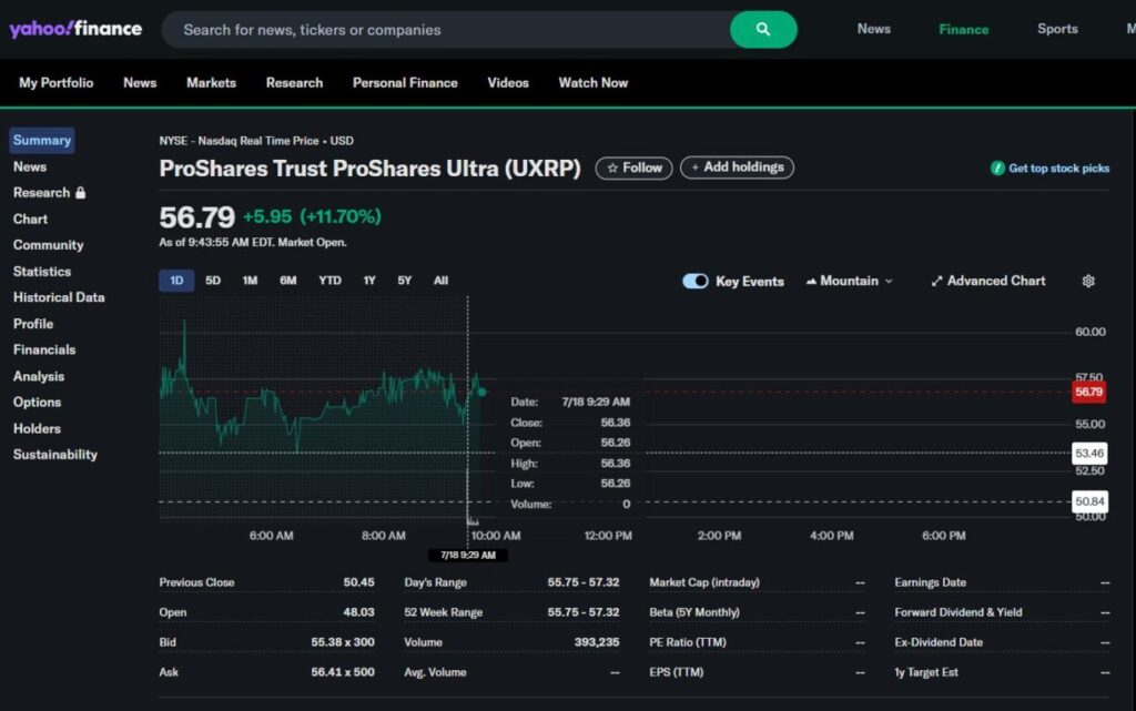 روز گذشته شرکت پروشرز رسما صندوق ETF اهرمی خود با نماد UXRP را در بورس نیویورک آرکا (NYSE Arca) راهاندازی کرد. این صندوق در روز نخست با قیمت ۵۰.۸۴ دلار کار خود را آغاز کرد، به اوج روزانه ۵۷.۸۶ دلار رسید و در نهایت با رشدی ۶.۱ درصدی، در قیمت ۵۳.۹۴ دلار بسته شد.