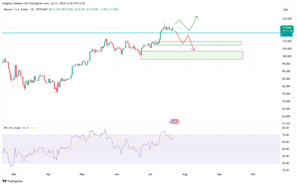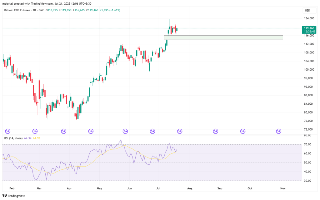 با توجه به بررسیهای هفته گذشته در تحلیل هفتگی قیمت بیت کوین، ۲۳ تیر ۱۴۰۴، هنوز گپ CME بین ناحیه ۱۱۴ تا ۱۱۵ هزار دلار پر نشده و همچنان نزدیکترین منطقه برای اصلاح است. در صورتی که قیمت از این منطقه (۱۱۵ هزار دلار) بیشتر کاهش یابد، احتمالا شاهد اصلاح عمیقتری خواهیم بود.