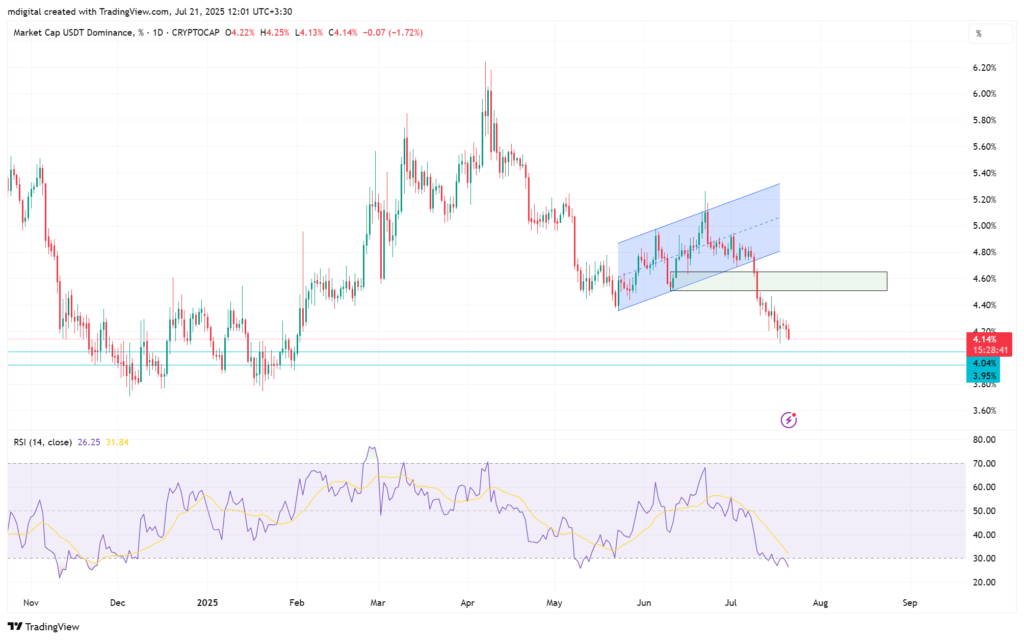 دامیننس تتر در تایم فریم روزانه بهخوبی به نزول خود ادامه داده و فعلا در ناحیه ۴.۱۵٪ قرار دارد.