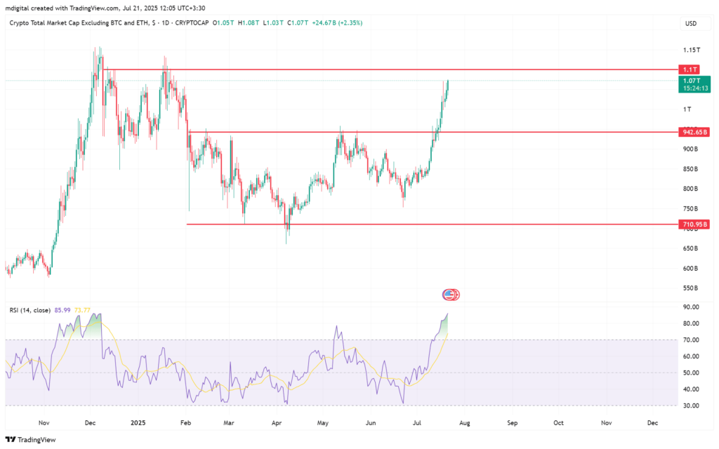 قیمت بیتکوین در محدوده ۱۱۸,۵۰۰ دلار ثابت مانده، در حالی که اتر و سایر آلتکوینهای اصلی به روند صعودی خود در چرخهای ادامه دادند که میتواند بهطور بالقوه آغازگر آلت سیزن بعدی باشد.