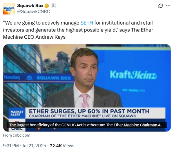 کیز روز دوشنبه در برنامه Squawk Box شبکه CNBC، در حالی که در مورد شرکت خزانهداری اتریوم جدید خود که قصد عرضۀ عمومی دارد صحبت میکرد، گفت: