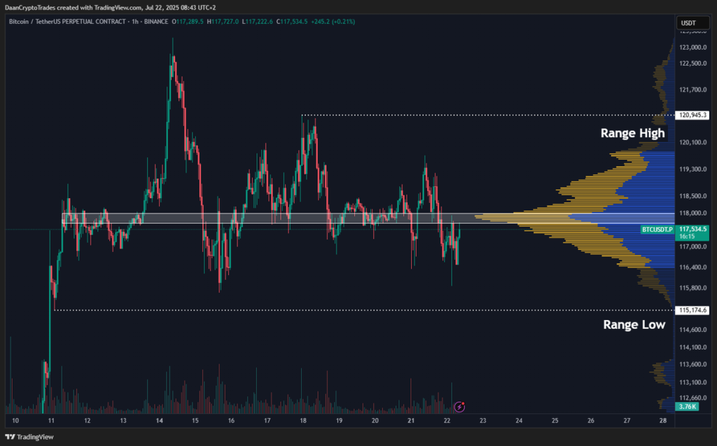 همچنین، تحلیلگر دیگری به نام دان کریپتو تریدز (Daan Crypto Trades) تأکید کرد که قیمت بیت کوین در نزدیکی اوج تاریخی متوقف شده و بیشترین حجم معاملات در محدوده ۱۱۸,۰۰۰ دلار (یعنی میانه باند نوسانی فعلی) صورت گرفته است.