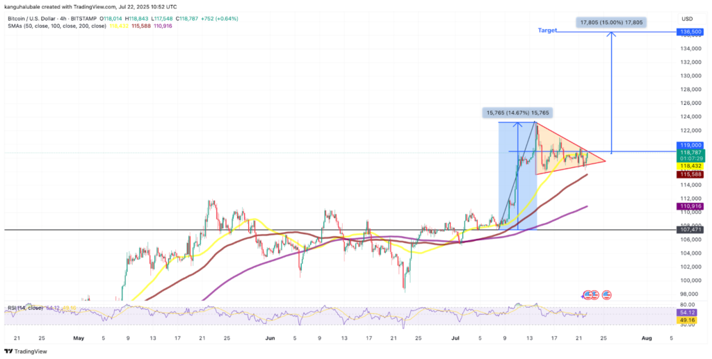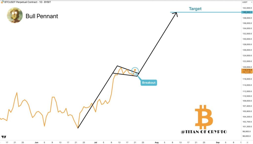 الگوی پرچم صعودی زمانی شکل میگیرد که پس از رشدی شدید، قیمت BTC وارد مرحله تثبیت در محدوده بالای قیمتی شود. در صورت شکست این الگو از سمت بالا، حرکت بعدی میتواند ۱۵٪ رشد دیگر را به همراه داشته باشد و قیمت را به حدود ۱۳۶,۵۰۰ دلار برساند.