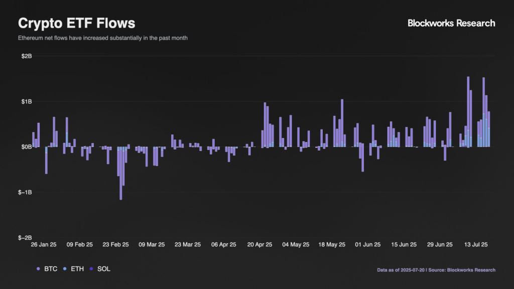 مت هوگان (Matt Hougan)، مدیر ارشد سرمایهگذاری در «بیتوایز»، اشاره میکند که از اواسط ماه می، محصولات قابل معامله در بورس (ETP) و شرکتهای سهامی عام مجموعاً ۲.۸۳ میلیون اتریوم (معادل ۱۰ میلیارد دلار) خریداری کردهاند. این میزان تقاضا، ۳۲ برابر عرضه جدید اتریوم در همین بازه زمانی بوده و عامل اصلی رشد ۶۰٪ قیمت اتر در ماه گذشته است.
