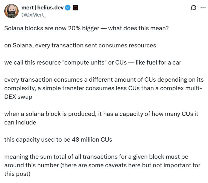 شبکه سولانا روز سهشنبه ظرفیت هر بلاک خود را ۲۰٪ افزایش داد و حد مجاز را به ۶۰ میلیون واحد محاسباتی (CU) رساند و قصد دارد که این ظرفیت را پیش از پایان سال باز هم افزایش دهد.
