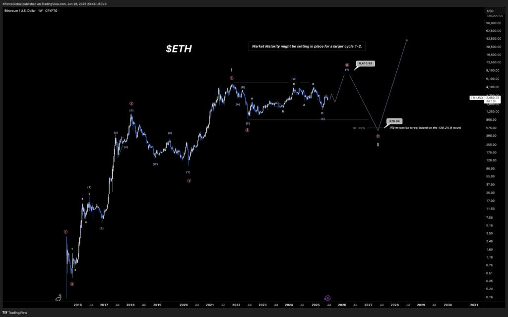 دیدگاهی از تحلیل بر اساس امواج الیوت (Elliott Wave analysis) ناشی میشود که فرض میکند قیمتهای بازار در پنج الگوی موجی تکرارشونده و روانشناختی حرکت میکنند. طبق تحلیل XForceGlobal که یک ماه پیش منتشر شد (و بخشی از آن قبلاً تأیید شده، هرچند کمی زودتر از پیشبینی)، به نظر میرسد اتریوم در حال پیشروی در یک موج ایمپالسیو (جنبشی) سوم است. اگر این الگو پابرجا بماند، این فاز میتواند تا اوایل سال ۲۰۲۶ به اوج خود در حدود ۹٬۰۰۰ دلار برسد؛ البته باید شرایط کلان اقتصادی همچنان حمایتی باقی بماند. این اتفاق، جهش بزرگ بعدی اتریوم را پیش از شروع رکود بعدی بازار رقم خواهد زد.