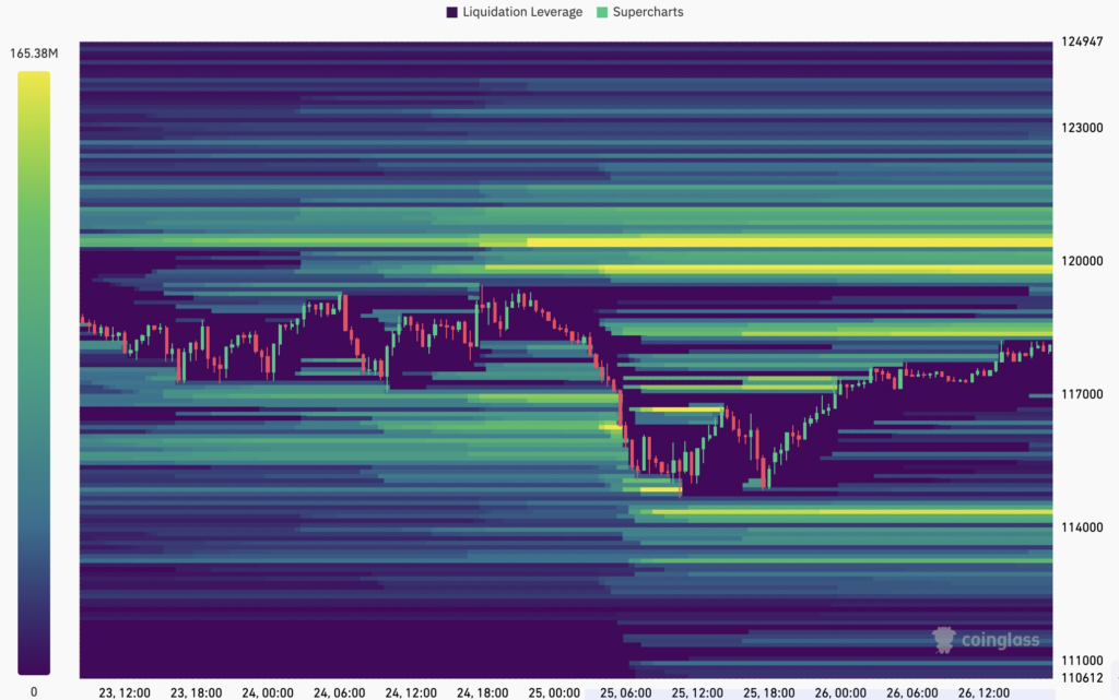تحلیلگران پیشتر انتظار داشتند که قیمت بیت کوین برای جذب نقدینگی، سطوح بالا و پایین را لمس کند و از ۱۱۴٬۰۰۰ تا ۱۱۸٬۵۰۰ دلار بهعنوان محدوده کلیدی یاد شده بود. دادههای جدید از پلتفرم CoinGlass نیز تأیید میکند که با عبور از ۱۱۸٬۰۰۰ دلار، نقدینگی بالایی جذب شده و اکنون چشمها به سمت ۱۲۰٬۵۰۰ دلار دوخته شدهاند.