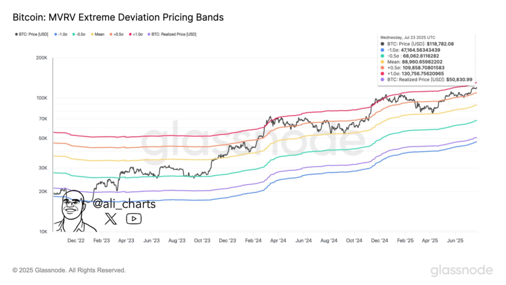 در ادامه تحلیلها، برخی کارشناسان با بررسی ساختار تکنیکال بیت کوین، رسیدن به ۱۳۰٬۰۰۰ دلار را در صورت حفظ حمایتها کاملاً محتمل میدانند. علی مارتینز (Ali_charts) تحلیلگر محبوب در پستی در X، با استفاده از مدل باندهای MVRV گلسنود اعلام کرد اگر بیت کوین بتواند بالای سطح ۱۱۰٬۷۵۶ دلار باقی بماند، میتواند به محدوده ۲.۰+ انحراف استاندارد برسد که معادل ۱۳۰٬۰۰۰ دلار است.
