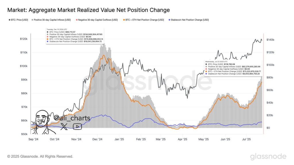 با وجود عبور قیمت از ۱۱۸٬۰۰۰ دلار، هنوز جریان ورودی سرمایهها (Inflows) به بازار پایینتر از اوجهای قبلی است. طبق دادههای علی (Ali) از گلسنود، میزان ورودی سرمایه در ۳۰ روز اخیر تنها ۸۲ میلیارد دلار بوده، در حالی که این عدد در ماه دسامبر و زمانی که بیت کوین در سطح ۹۶٬۰۰۰ دلار قرار داشت، ۱۳۵ میلیارد دلار بود.