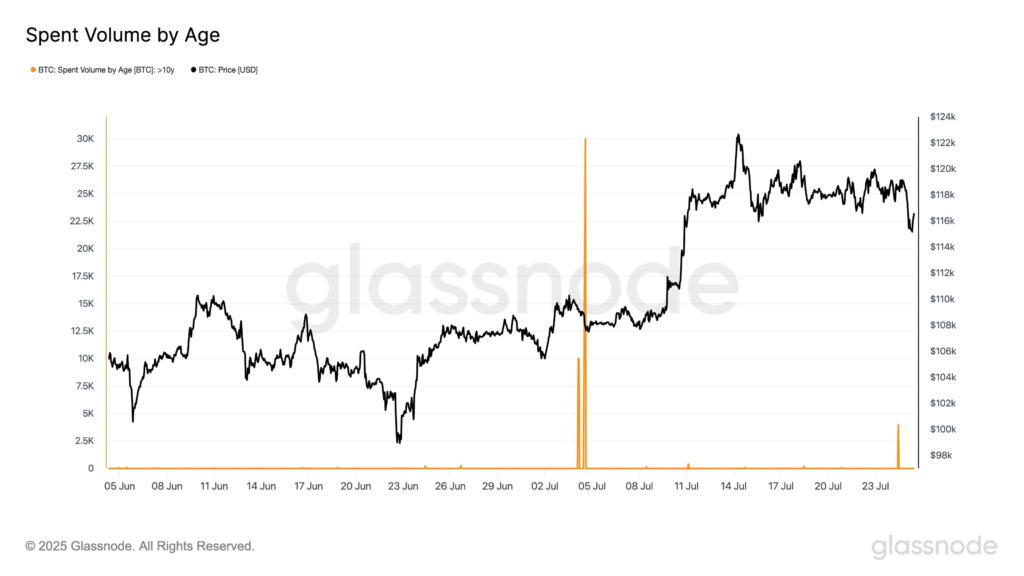 روز پنجشنبه، موجی دیگر از بیت کوینهای قدیمی در شبکه جابهجا شد و ۳٬۹۰۰ واحد بیت کوین که بیش از ۱۰ سال عمر داشتند، فعال شدند. این اتفاق در ادامه جابهجایی ۸۰٬۰۰۰ بیت کوین در تاریخ ۴ جولای ۲۰۲۵ (۱۳ تیر ۱۴۰۴) رخ داد. چنین فعالیتهایی از سوی منابع عرضهای که برای مدت طولانی غیرفعال بودهاند، اغلب نشاندهنده تخصیص مجدد داخلی، جابهجایی دارایی نزد متولیان یا در برخی موارد، فشار فروش هستند.