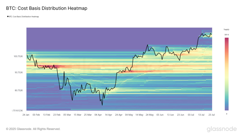 رالی شدید قیمت بیت کوین از ۱۱۰٬۰۰۰ دلار تا ۱۱۷٬۰۰۰ دلار، یک شکاف قیمتی آنچین یا منطقهای با تراکم کم انباشت ایجاد کرد. از زمان ثبت سقف تاریخی ۱۲۲٬۰۰۰ دلاری، قیمت بالاتر از این شکاف باقی مانده است. اما اگر حمایت شکسته شود، تاریخ نشان میدهد چنین شکافهایی میتوانند به مناطق شکلگیری کف تبدیل شوند.