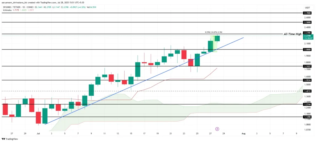 میم کوین اسپیاکس (SPX) از ابتدای ماه جولای وارد روندی صعودی شده و در این مسیر موفق به ثبت چندین اوج تاریخی شده است. آخرین رکورد قیمتی این توکن امروز در سطح ۲.۲۷ دلار به ثبت رسیده که نشاندهنده افزایش قابل توجه علاقه سرمایهگذاران و بهبود احساس بازار نسبت به آن است.