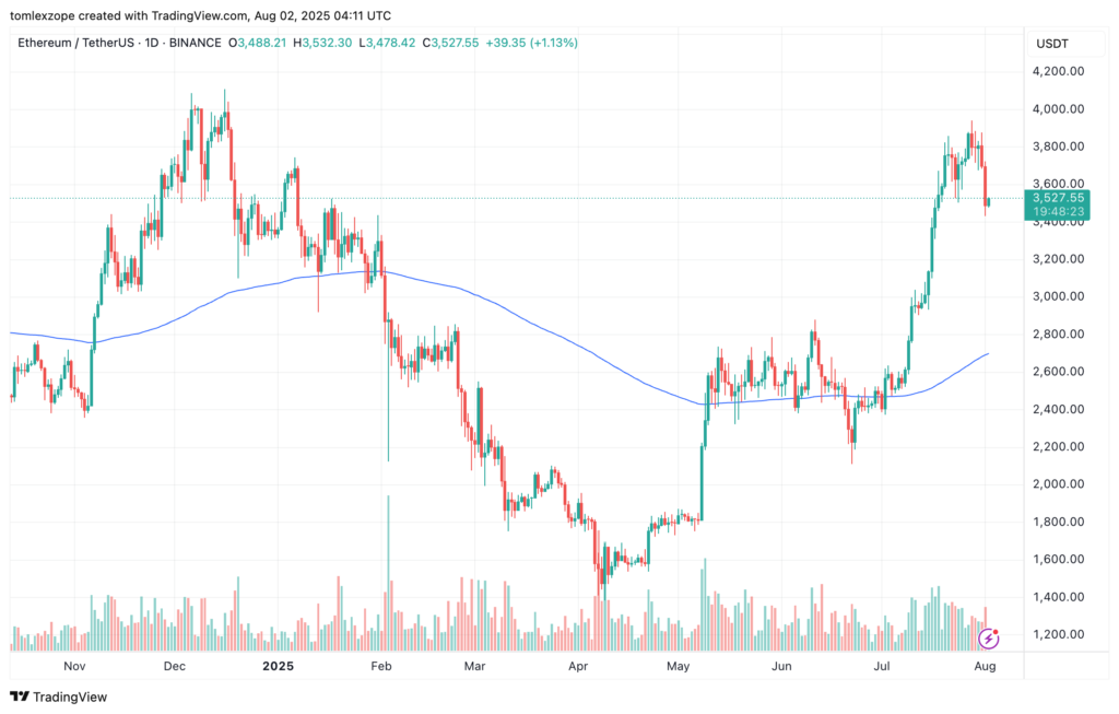 به گزارش میهن بلاکچین، در روز جمعه، ۱ آگوست (۱۰ مرداد)، قیمت اتریوم با کاهش قابلتوجهی مواجه شد و به زیر سطح ۳٬۵۰۰ دلار کاهش یافت. این موضوع، تردیدهایی را درباره احتمال بازگشت قیمت ETH به بالای سطح روانی ۴٬۰۰۰ دلار و حتی رسیدن به اوج تاریخی جدید ایجاد کرده است. با این حال، شاخصهای آنچین اخیر نشان میدهند که «پادشاه آلتکوینها» هنوز به پایان مسیر خود نرسیده است.