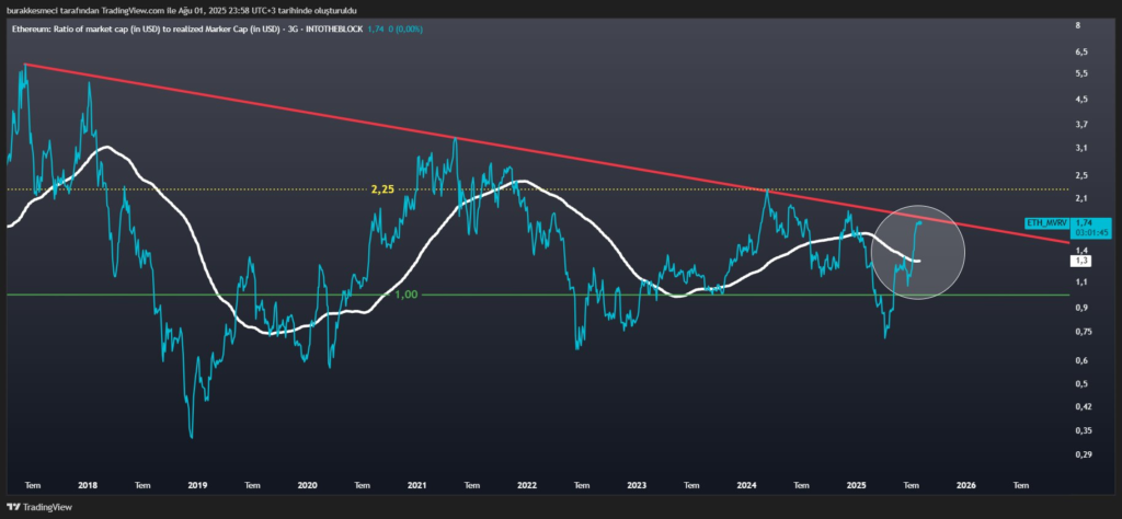 بوراک کِسمِجی (Burak Kesmeci)، تحلیلگر رمزارز، در پستی در پلتفرم X در روز جمعه اظهار داشت که با وجود چالشهای اخیر، قیمت اتریوم ممکن است هنوز پتانسیل صعودی داشته باشد. این ارزیابی بر پایه نسبت MVRV انجام شده است که نسبت بین ارزش بازار و ارزش تحققیافته یک دارایی را اندازهگیری میکند.