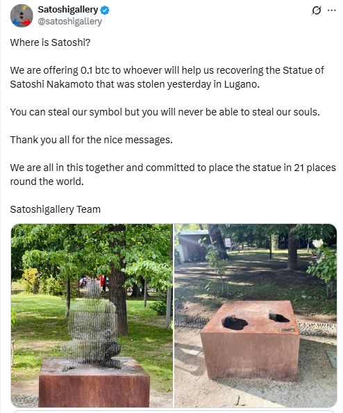 ما برای کسی که بتواند در بازگرداندن مجسمه ساتوشی ناکاموتو کمک کند، ۰.۱ بیت کوین پاداش میدهیم. شما میتوانید نماد ما را بدزدید، اما هرگز نمیتوانید روح جمعی ما را تصاحب کنید. ما متحد هستیم و این مجسمه را در ۲۱ نقطه جهان نصب خواهیم کرد.