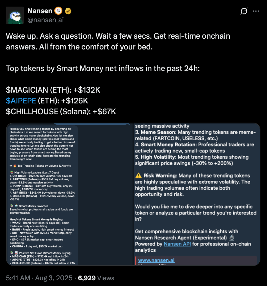 در همین حال، پلتفرم نانسن (Nansen) اعلام کرد که سه توکن مجیشن (MAGICIAN)، ایآیپپه (AIPEPE) و چیلهاوس (CHILLHOUSE) بیشترین ورود پول هوشمند (Smart money) را در تعطیلات آخر هفته تجربه کردهاند.