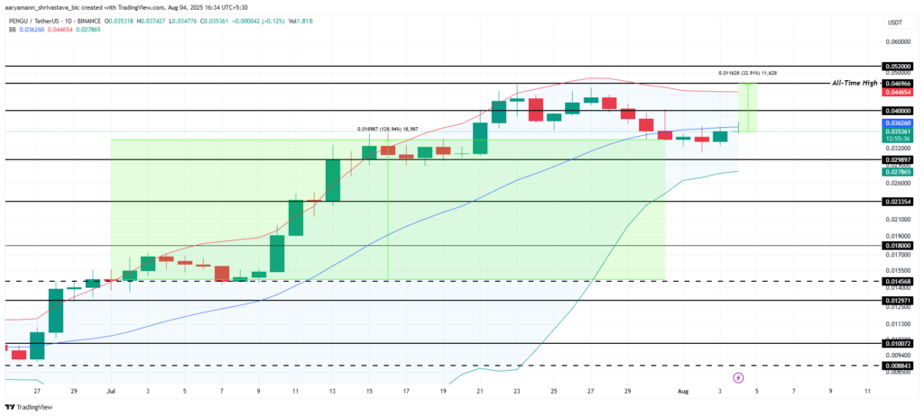 اگر مقاومت ۰.۰۴۰ دلار شکسته شود، هدف بعدی برای این توکن سطح ۰.۰۵۲ دلار خواهد بود؛ این سطح میتواند آغاز یک روند صعودی تازه و حتی ثبت سقف تاریخی جدیدی برای PENGU باشد.