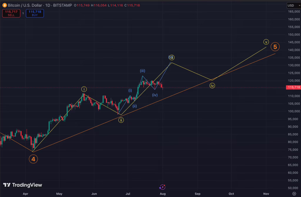 قیمت بیت کوین همچنان در رکود تابستانی گرفتار است، اما مسیر مورد انتظار را دنبال میکند. انتظار میرود بهزودی حرکت پنجموجی که در نمودار با خط آبی نشان داده شده، کامل شود. این حرکت، پایان موج سوم (خط زرد) از موج پنجم (خط نارنجی) خواهد بود. بهطور کلی، ما هنوز در مسیر رسیدن به قیمت ۱۳۵,۰۰۰ تا ۱۴۰,۰۰۰ دلار تا پایان سال ۲۰۲۵ هستیم.