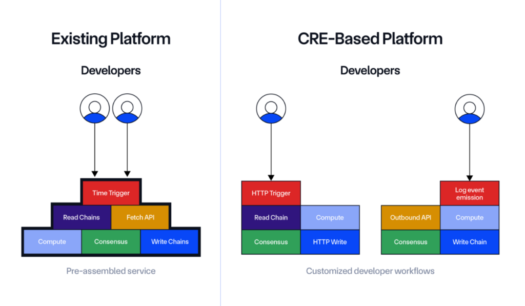 توسعهدهندگان میتوانند در محیط CRE از زبانهای برنامهنویسی جاوا اسکریپت، TypeScript یا Go استفاده کنند. تمام عملیات از خواندن دادههای بلاکچینی گرفته تا دریافت اطلاعات از APIها، اجماع و نوشتن دادهها روی شبکه، توسط شبکه اوراکل غیرمتمرکز چینلینک (DON) مدیریت میشود.
