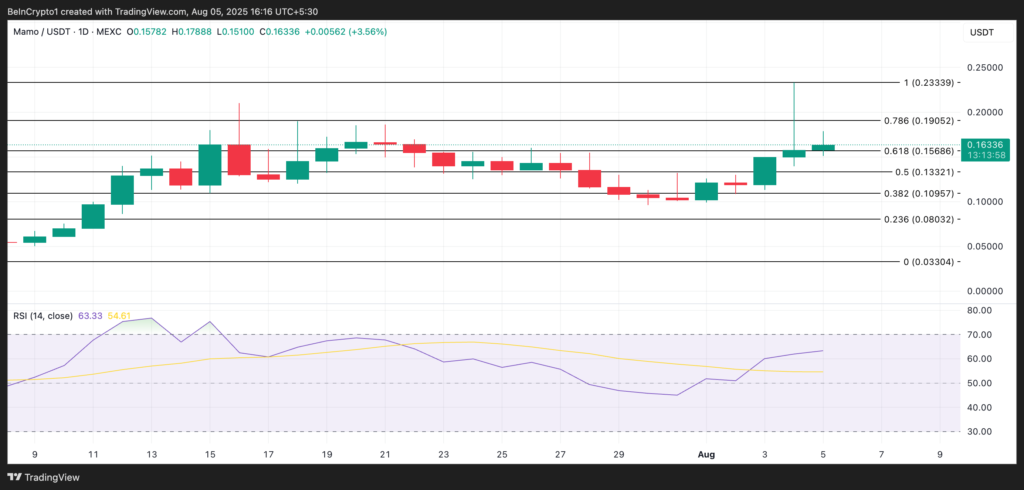 در بازه هفتگی، قیمت MAMO حدود ۴۰٪ افزایش یافته و شاخص قدرت نسبی (RSI) آن نیز نشان از ادامه این روند صعودی در کوتاهمدت دارد. این شاخص که وضعیت اشباع خرید یا فروش یک دارایی را نشان میدهد، در حال حاضر عدد ۶۳.۲۳ را نشان میدهد و در یک مسیر صعودی قرار دارد.