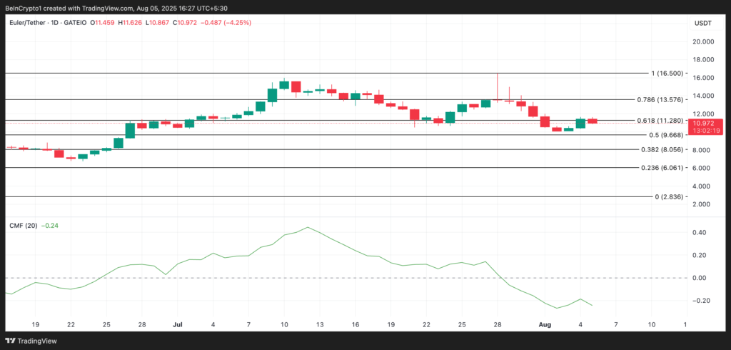با این حال تحت تأثیر رکود کلی بازار، در طول هفته گذشته EUL بیش از ۱۶٪ کاهش یافته است. نگاهی به شاخص جریان پولی چایکین (CMF) در نمودار روزانه EUL/USD نشان میدهد که فشار فروش بر بازار حاکم شده؛ چرا که مقدار این شاخص در حال حاضر ۰.۲۴- و نزولی است.
