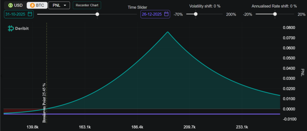 این موقعیت بیشترین سود را زمانی به دست میآورد که بیت کوین در تاریخ ۲۶ دسامبر نزدیک ۱۶۰٬۰۰۰ دلار باشد و در این صورت ۰.۱۱۲ بیت کوین (حدود ۱۳٬۰۵۰ دلار) سود ایجاد میکند. با این حال، اگر قیمت بیت کوین از ۱۷۸٬۵۰۰ دلار فراتر رود، زیان آغاز میشود، هرچند وجود آپشن خرید ۲۰۰٬۰۰۰ دلاری باعث محدود شدن زیان احتمالی خواهد شد. در این حالت، حداکثر زیان ۰.۱۰۹ بیت کوین، معادل حدود ۱۲٬۷۰۰ دلار است.