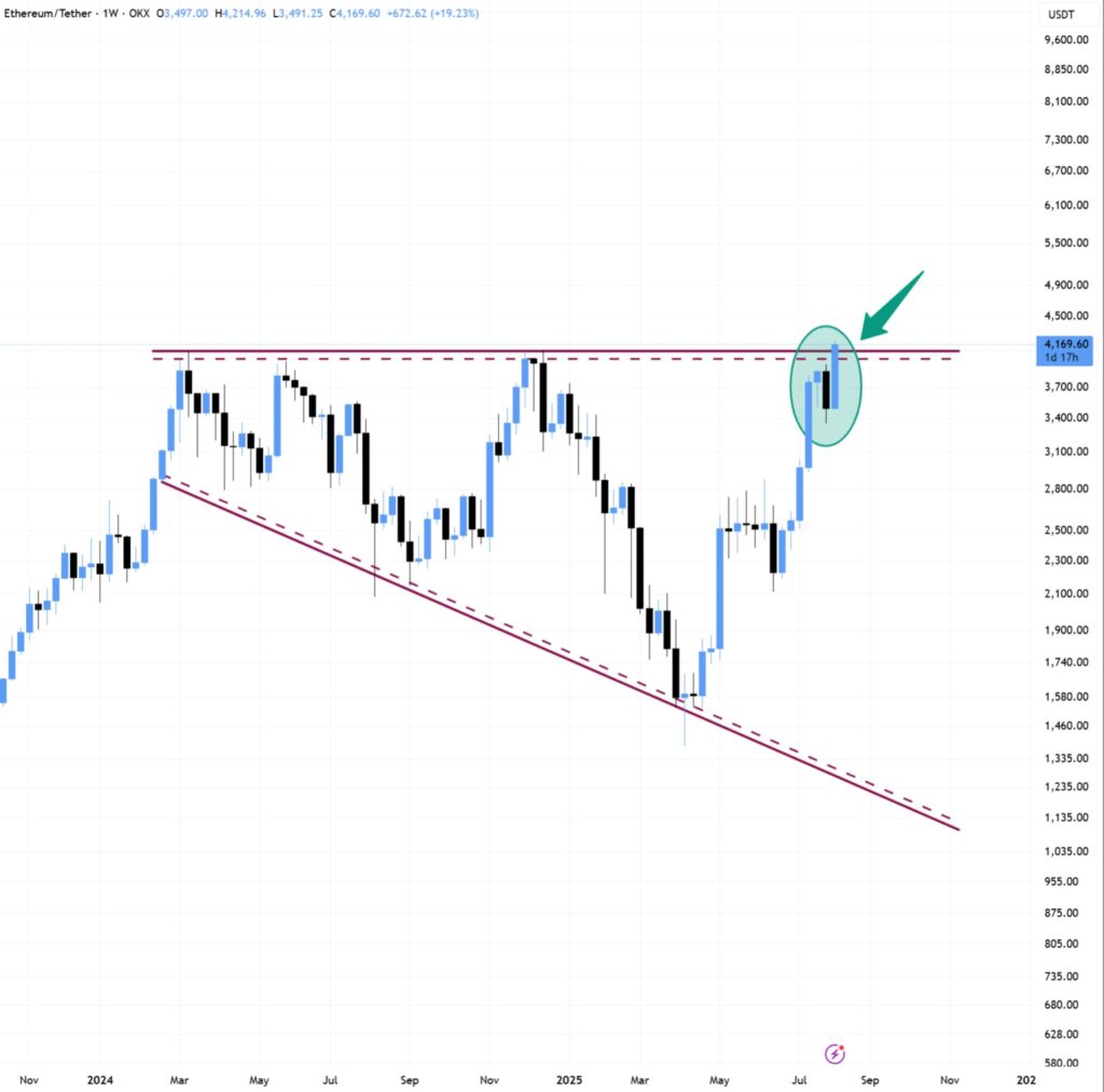 اتریوم امروز با یک شورت اسکوئیز (Short Squeeze) و خرید سنگین سرمایهگذاران نهادی، از ۴,۱۰۰ دلار عبور کرد. مرحله بعدی چیست؟ اتریوم باید هفته را بالای این سطح به پایان برساند. اگر این اتفاق بیافتد، احتمال ثبت اوج تاریخی جدید در یک تا دو هفته آینده بسیار بالاست.